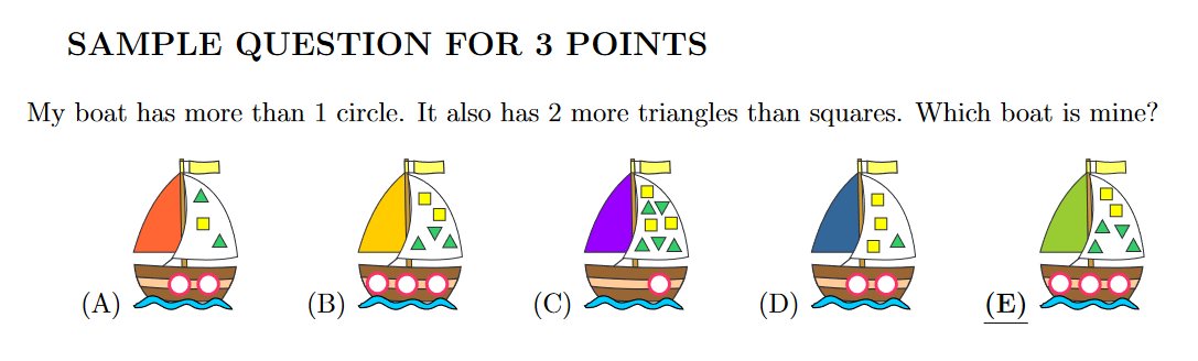 学术活动语言: 英语 /中文 学术活动形式: 个人 难度说明: 该赛事从小学至高中分为 6 个难度等级 等级 1-Level 1:小学 1 至 2 年级 等级 2-Level 2:小学 3 至 4 年级 等级 3-Level 3:小学 5 至 6 年级 等级 4-Level 4:中学 7 至 8 年级 等级 5-Level 5:中学 9 至 10 年级 等级 6-Level 6:中学 11 至 12 年级 等级 0-Level 0:学龄前儿童