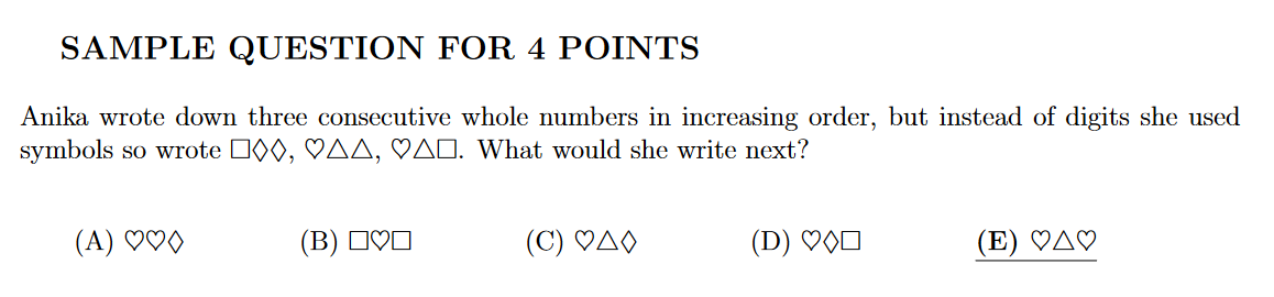 在七、八年级的考试中,袋鼠数学竞赛的问题往往涉及模式识别和问题解决。学生的任务是识别和理解数学模式,并运用这些知识解决问题。这一阶段鼓励学生发展更具分析性和逻辑性的数学方法,磨练他们在各种数学情境中识别和利用模式的能力。